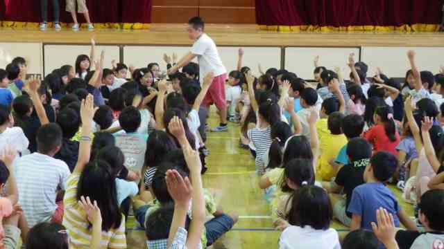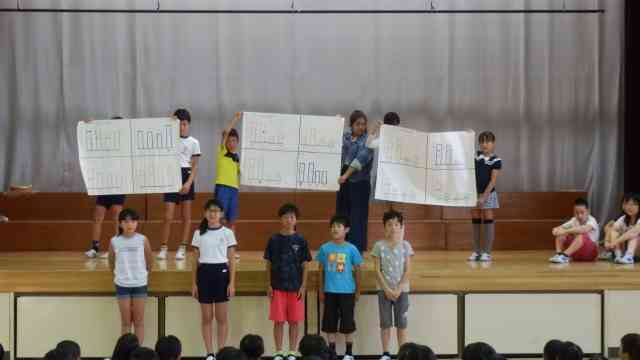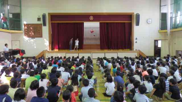 10月10日(水) 今日の児童集会は、投げられたものが何なのか、カーテンの間から見て当てるというクイズ。動体視力が試されます。というほどの難問ではなかったですが・・・ 最後に代表委員会からも、先日の全校朝会で校長先生の話をちゃんと聞いているか調査した結果の発表がありました。 みなさん、お話しをちゃんと聞きましょう。
