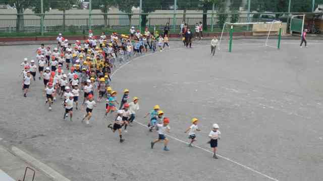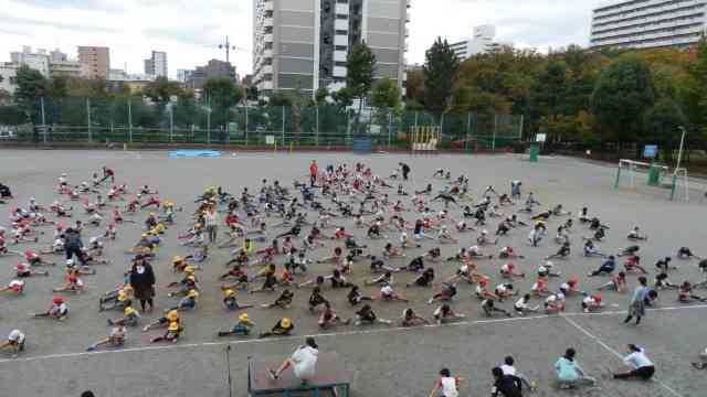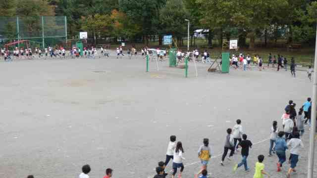 11月7日(水) 今日の体育朝会は。全校で持久走の練習をしました。今日は実際のトラックに沿って3分間自分のペースで回りました。スタートも低・中・高学年で異なるので、その場所の確認もしました。300人以上の大勢で走ったので、混雑しましたが、一生懸命走りました。27日の本番に向けて、持久力を付けていってほしいです。