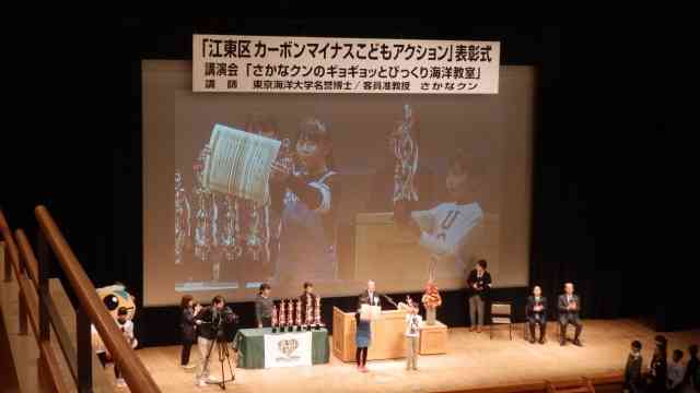 11月9日(金) 今日の午後は、5,6年生が、ティアラこうとうで行われた「カーボンマイナスこどもアクション」の表彰式に行ってきました。この「カーボンマイナスこどもアクション」は、6月に区内の全小学校で取り組んだものです。1か月の間、各家庭での省エネに係わるいろいろなことに取り組んで、その結果を学校ごとに集計したものです。亀高小学校は、区で上位9校に入っていたので表彰式に行くことができました。会場で各賞の発表があり、亀高小学校は努力賞をいただきました。順位発表は大いに盛り上がりました。後半は、さかなクンによる海の魚やその環境についての講演があり、とても楽しく興味深く聴いて勉強になりました。ギョギョ!【添付ファイル】