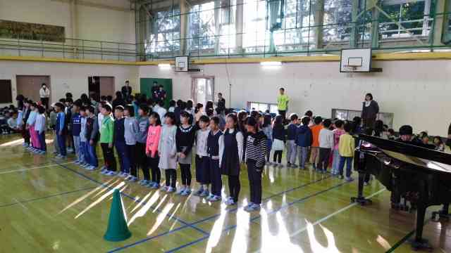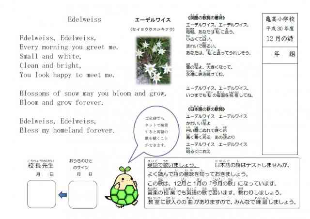12月19日(水) 今日の音楽朝会は「Edelweiss」(エーデルワイス)を英語で歌いました。実は、この曲は今月の歌(12月と1月)になっていますが、今月の「詩の暗唱」の詩でもあります。毎年12月には、詩の暗唱で英語の歌にチャレンジしていますが、今年は音楽の「今月の歌」とコラボしているので、音楽の授業でも教わっています。今回は、発声練習のあと、すでに校長室での「詩の暗唱」を合格した人がお手本となって、真ん中で歌ってくれました。高学年からはきれいなソプラノの歌声が聞こえてきました。1月の音楽朝会でも、さらにきれいな歌声が聴けることを楽しみにしています。【添付ファイル】