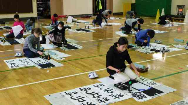 1月10日(木) 今日は、今季一番の冷え込みで寒い日でしたが、4年生(1,2校時)と6年生(3,4校時)が体育館で書初め会を行いました。体育館は冷え込みが激しいので、石油ストーブを2台使って暖めました。4年生は「元気な子」6年生は「旅立つ時」です。いい姿勢で一生懸命書いていました。 1,2年生は、教室で硬筆で書初めをしました。 作品掲示をお楽しみに。