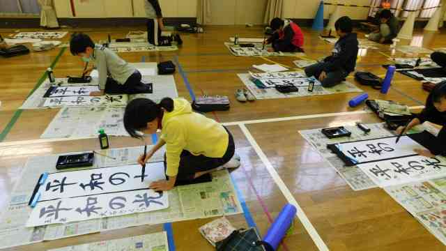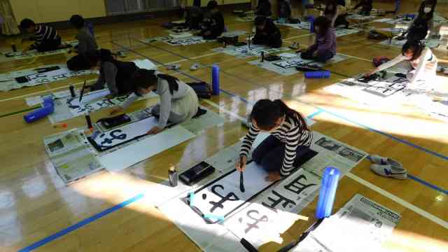 3年生(1,2校時)と5年生(3,4校時)が体育館で書初め会を行いました。体育館は昨日よりはまだ冷え込みは激しくありませんが、石油ストーブを2台使って暖めました。3年生は「お正月」5年生は「平和の光」です。いい姿勢で一生懸命書いていました。作品掲示をお楽しみに。