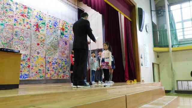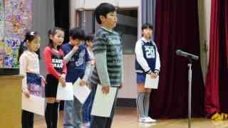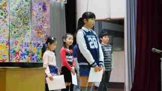 2月25日(月) 今日の全校朝会は、第4回詩の暗唱コンテストの最優秀賞の発表を行いました。今年で4回目になるこのコンテストは、2月の今月の詩を自分で作った詩にして、それを暗唱して発表しました。この詩の暗唱は各学級でお互いに聞き合って、詩の内容や読むときの表現力が優れている人を3名選出し優秀賞となりました。さらに、選ばれた学年6名は校長室で最終審査をして学年で1名の最優秀賞を選びました。今日は、各学年最優秀賞の人の表彰と発表です。みんなのお手本となる詩の暗唱を聞かせてくれました。【添付ファイル】