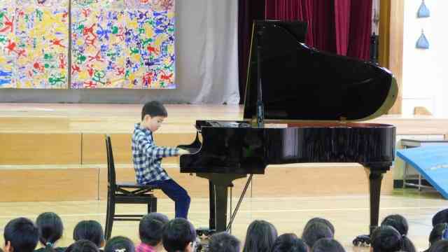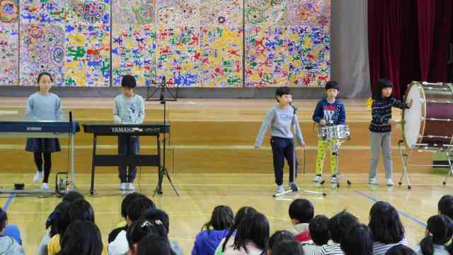 2月27日(水) 今日の児童集会はパフォーマンス集会でした。集会委員会主催の毎年恒例の集会ですが、今回もたくさんの人の応募があったようです。事前のオーディションで選ばれた人が、思い思いのパフォーマンスを披露しました。朝の時間は3組。初めに、「ウィー・ウイル・ロック・ユー」のバンド。ロックを出し物にしたのは初めてではないでしょうか。次にダンス。ソロで踊りました。最後にピアノ独奏。どのパフォーマンスも活き活きしていて盛り上がりました。【添付ファイル】