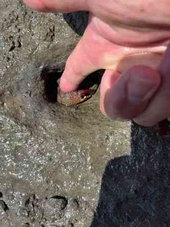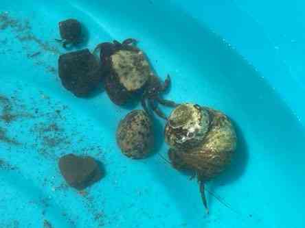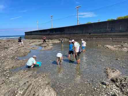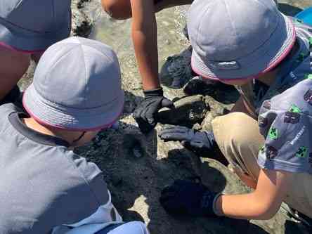 ヤドカリやカニ、貝をたくさん捕まえました。 ナマコや小さな魚までいました。 大きなカニは穴から出すことができず。
