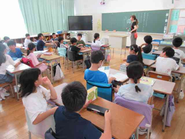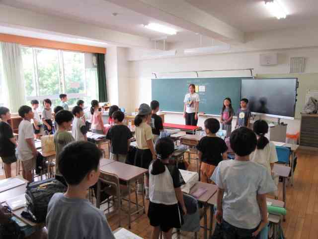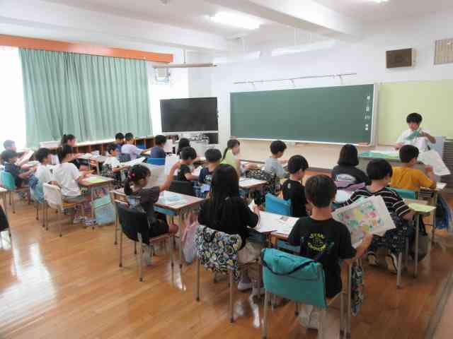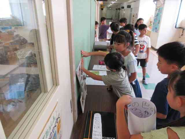 3,4年生の様子です。 久々に会えた友達と笑顔でコミュニケーションを図っている姿がたくさん見られました。 全校朝会の行進の姿勢がとてもよかったので、意識を高くもって前期後半に臨んでいると感じました。 クラスによっては夏休みの自由研究の展示を始めていました。 友達の研究に興味津々でした。