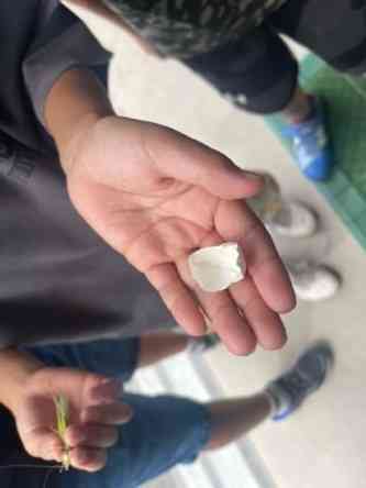 休み時間にちょうど太陽に雲がかかり、気温も低くなりました。 「今日は校庭が使えます」と校内疱瘡が流れると、校舎内にこどもたちの歓声が響き渡りました。 久々の校庭を満喫する子、楽器の練習をする子、わんぱくの森で生き物探しをする子、それぞれが休み時間を楽しんでいました。 わんぱくの森のHP協力隊は鳥の卵の殻を持ってきてくれました。 最近鳩がたくさん来るので、鳩の卵でしょうか。