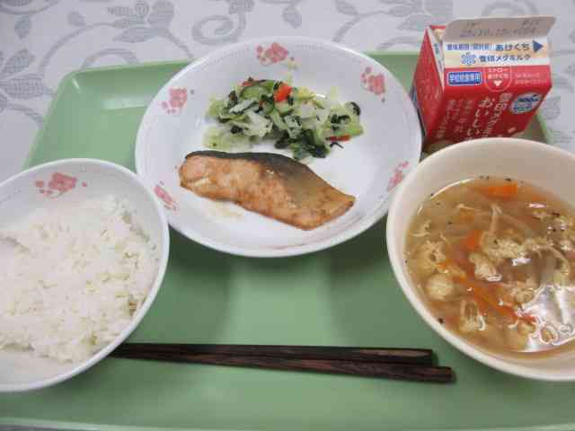今日の給食は ・牛乳 ・ご飯 ・ますの和風にんにくバター焼き ・彩りサラダ ・卵入りオニオンバジルスープ 今日は洋風メニューでした。