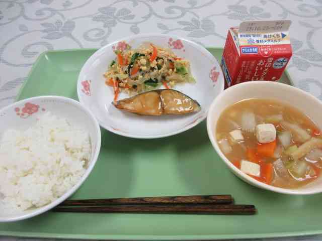 今日の給食は ・牛乳 ・ご飯 ・さわらのゆうあん焼き ・千草あえ ・みそちゃんこ汁 今日はお野菜たっぷりメニューです。 不足しがちな栄養素をとれます。