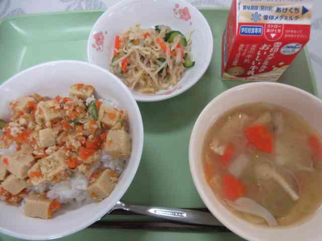 今日の給食は ・牛乳 ・高野豆腐のそぼろ丼 ・かみかみあえ ・具だくさんみそ汁 「何これ?」って声が聞こえてきましたが、高野豆腐です。 食べたことのない子もたくさんいますね。 丼にすると食べやすかったです。