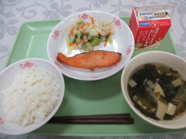 今日の給食は ・牛乳 ・ご飯 ・鮭の香味焼き ・揚げ大豆サラダ ・若竹汁 和定食メニューでした。